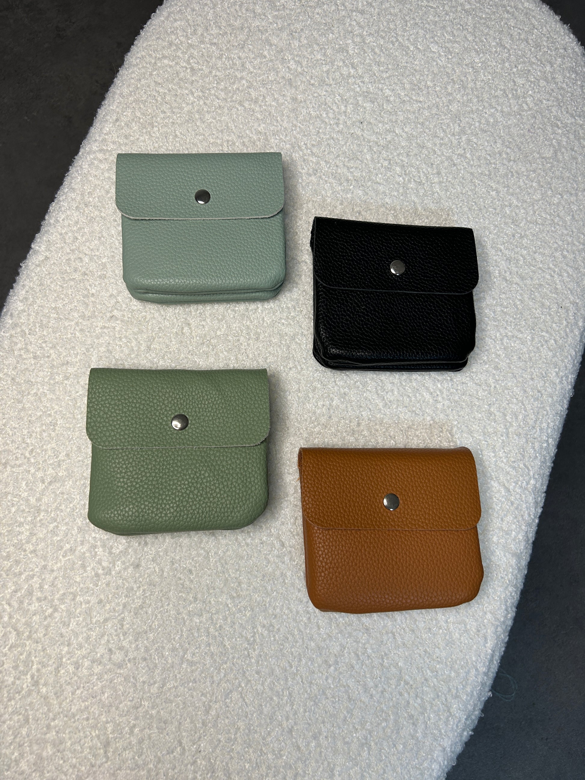 Die Geldbörse besteht aus Kunstleder und ist erhältlich in den Farben Mint, Olive, Schwarz und Kamel
