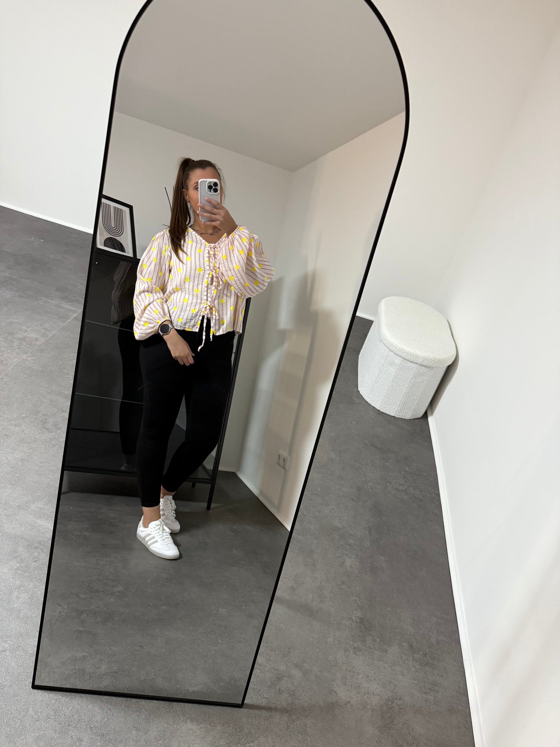 In Weiß mit beigen Streifen und gelben Herzen